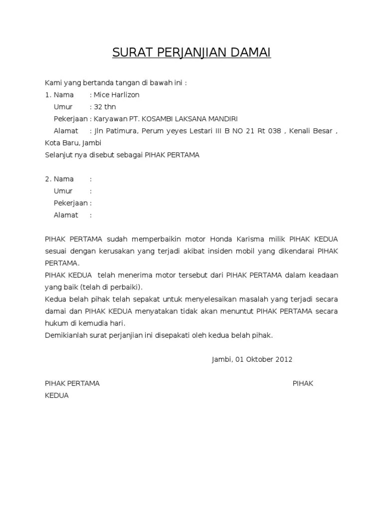 Contoh surat perjanjian damai kecelakaan lalu lintas jalan raya. Apakah anda mencari gambar tentang contoh surat damai kecelakaan? Simak contoh surat pernyataan damai kecelakaan terlengkap. Kami yang bertanda tangan dibawah ini : Contoh surat perjanjian perdamaian (kecelakaan meninggal dunia),.